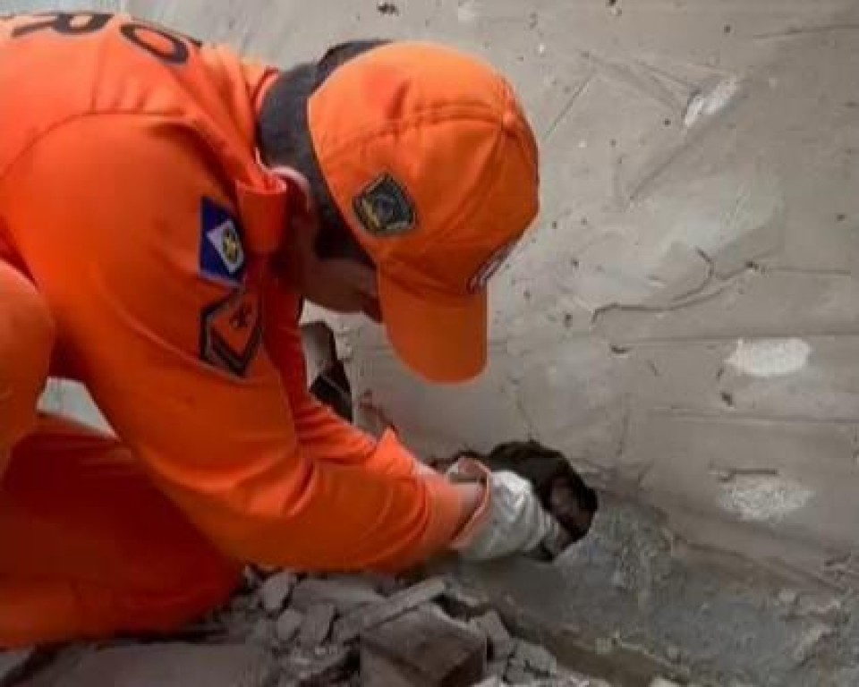 Bombeiros militares salvam quatro filhotes de cachorro que estavam presos em vão entre paredes